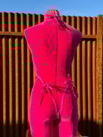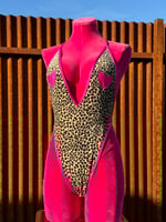 V neck cheetah one piece with pink holo neck and thong ties. Pink holo logo appliqué detail and signature logo on right hand side in pink UV reactive rhinestones.