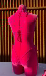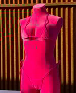Plush hot pink velour thong bottoms with UV pink rhinestone logo.